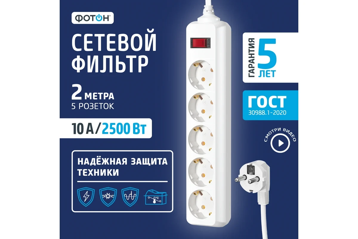 Сетевой фильтр ФОТОН предназначен для подключения нескольких электроприборов и их защиты от перегрузки, короткого замыкания и импульсных помех. Обеспечивает необходимую защиту бытовой, офисной и компьютерной техники.